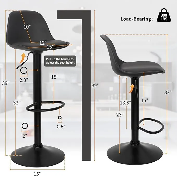 【HEIGHT ADJUSTABLE & 360 DEGREE SWIVEL BAR STOOLS】Seat width 14-16 inches, depth 12 inches, back height 10 inches.The 28" height 24 inch bar stools counter stool are suitable for 41"-43" height tall tables. Ergonomic one-piece molded-plastic bucket seat with the rounded back of the high top chairs provides good support to your back, foam cushioning and zigzag white-thread double stitching add comfort and strength, The legs of these shop stool consist of steel material, making them durable and holding up under use.