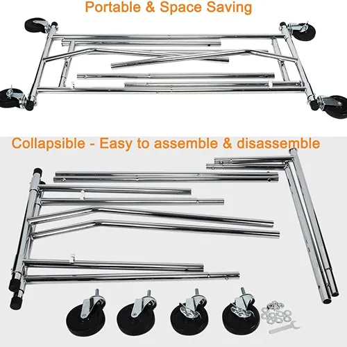 【Convenient to Move】- Our clothes rack comes with four removable rolling solid rubber casters (2 with locking brake) . Easy to move even fully loaded with clothes. Sturdy and reliable for commercial use such as shows, mobile clothing boutique.
