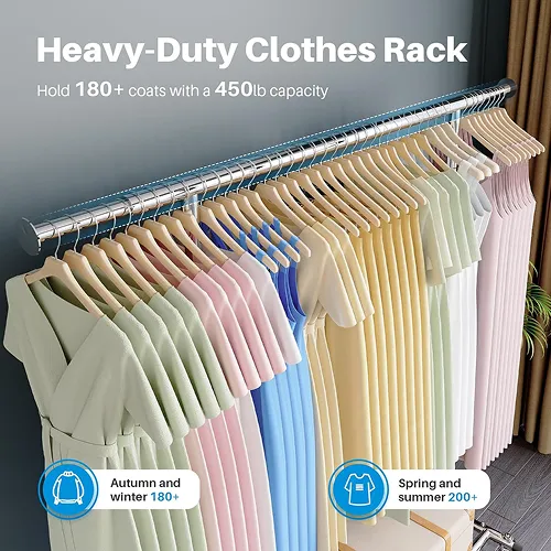 【300 Lbs Load Capacity】- Our garment rack is made of heavy duty steel with chrome finish. The thickness of our pole is 1.5mm, which makes this clothing rack much thicker and sturdier. The maximum load capacity is 300 lbs, strong enough for your storage needs.