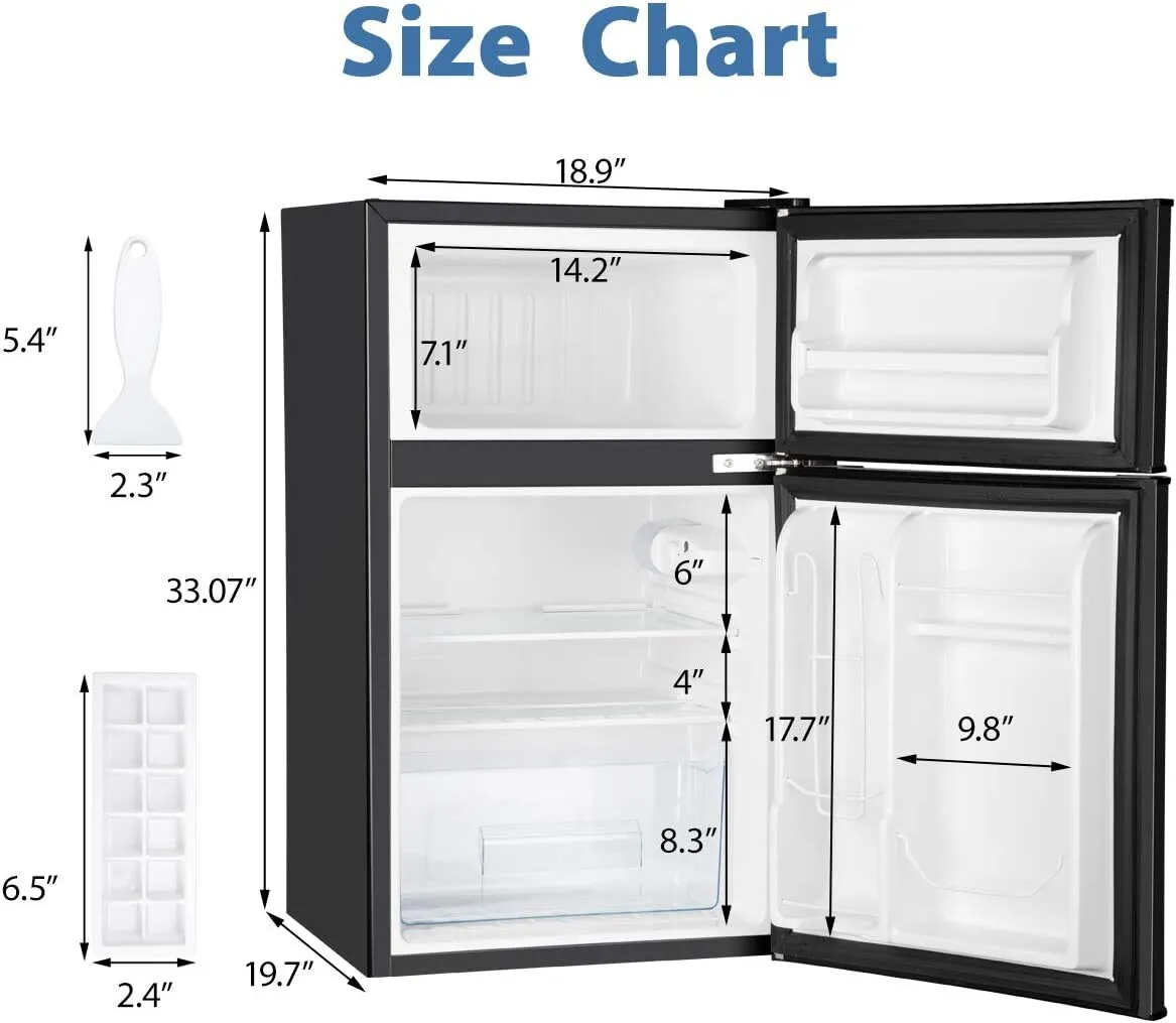 THE PERFECT COMBINATION OF FRIDGE-FREEZER - Combines the advantages of fridge and freezer to design the dorm fridge with freezer 2 door. Mini frdige has two storage zone at the same time. 0.96 Cu.Ft of freezer zone can be used to store ice cream or frozen food. 2.24 Cu.Ft of fridge zone can be used to preserve fresh fruits, vegetables or refrigerated drinks. When you buy a Small fridge it is equivalent to buying a fridge and a freezer at the same time!
